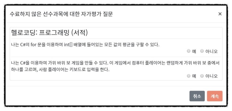 포큐에서도 이 입문용 강의의 선수과목이 헬로우코딩 입문책이라고 적혀있다. 다시말해 강좌를 구매하기 전에 저런 팝업창이 나온다. 해당 질문에 전부 예로 대답할 수 있다면 충분히 그 강좌를 들을 기초지식이 있다는 것이다. 그런데 이제 막 프로그래밍 배울려고 하는 사람이 가위바위보 게임을 만들 수 있다?! 난 못 할거라 본다.