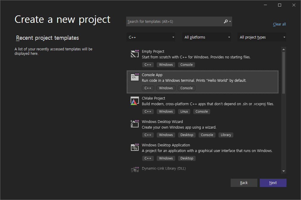 비쥬얼 스튜디오 2022를 기준으로 '새 프로젝트 만들기'를 선택하고 콘솔앱(Console App) 프로젝트를 실행합니다.