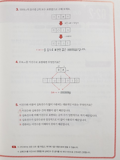 가장 쉬운 방법은 책에 설명된 모든 0과 1을 뒤집고 1을 더하는 것입니다. 또 다른 방법으로는 n 자릿수를 가진 이진수 N의 보수는 2^n - N 을 이용하는 것 입니다.