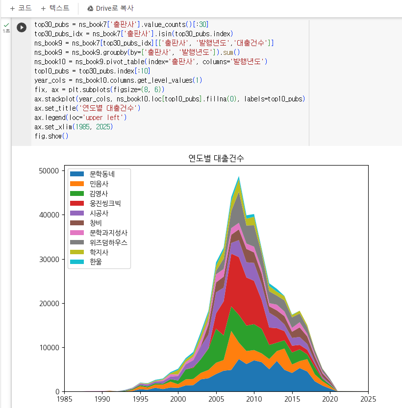 1. pivot_table() 메서드로 각 '발행년도' 열의 값을 열로 바꾸기