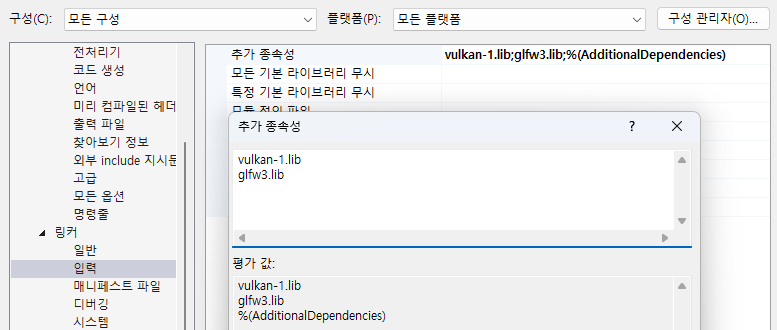 여기에는 vulkan-1.lib, glfw3.lib 를 입력합니다.