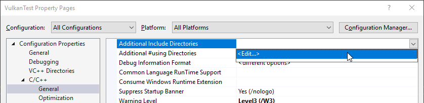 C/C++ → 일반(General) → 추가 포함 디렉터리(Additional Include Directories)로 이동하여 오른쪽 드롭다운 상자에서 <편집(Edit)...>을 누릅니다. 그리고 Vulkan, GLFW 및 GLM의 헤더 디렉토리를 추가합니다.