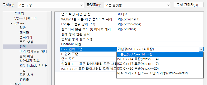 마지막으로 C/C++ → 언어 → C++ 언어 표준에서 ISO C++ 17 표준을 선택합니다.